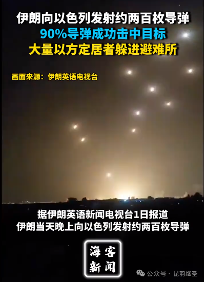 就在龙国完成撤侨的当晚,伊朗伊斯兰革命卫队司令萨拉米表示,伊朗向以色列发射了大约200枚导弹。据伊朗伊斯兰共和国广播电视台报道,伊朗伊斯兰革命卫队1日晚说,在当天对以色列的袭击中首次使用了法塔赫高超音速导弹,约90%的导弹成功命中目标。据以色列方面统计,以色列全境在一小时内共拉响了1864个警报。