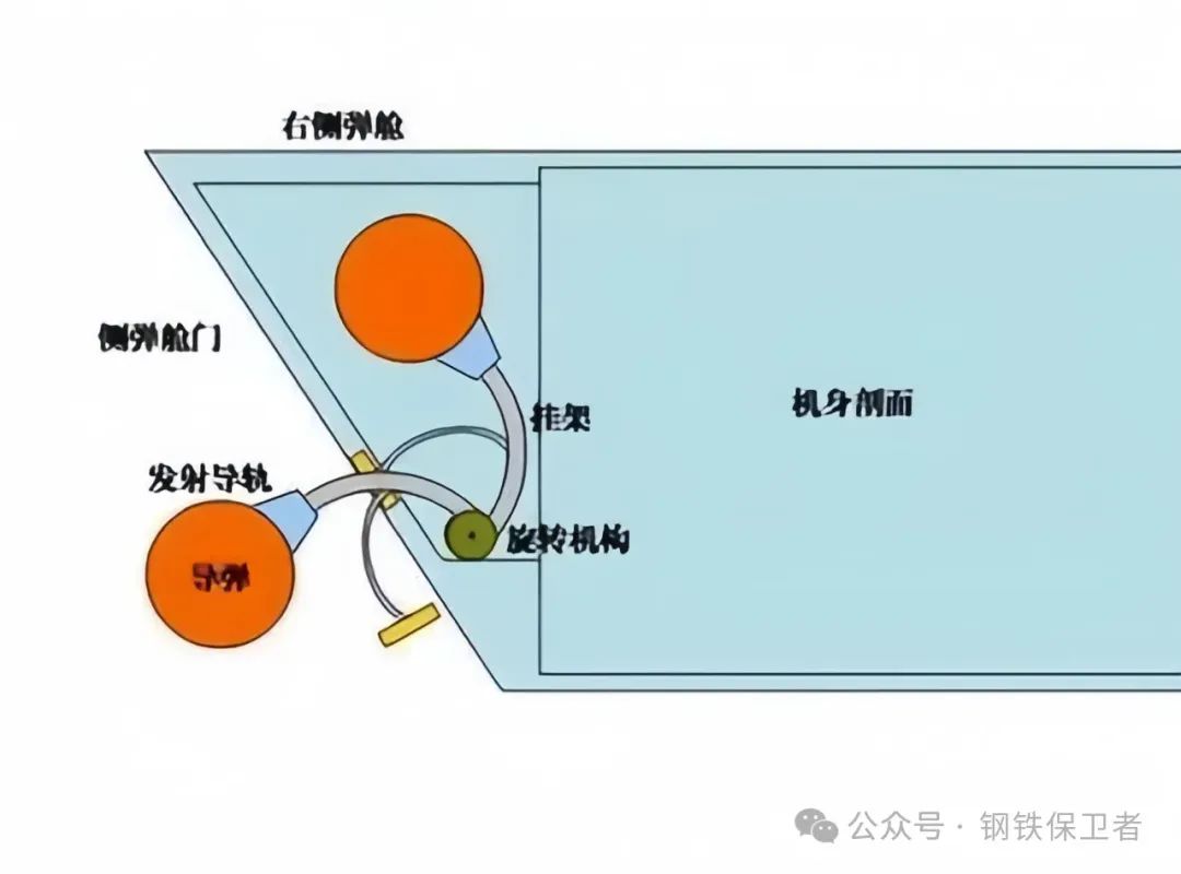 相比之下,歼-20的格斗弹发射方式便要完美很多。歼-20的副弹舱采用了非常巧妙的旋转式导轨挂架。在进入近距格斗前可以提前打开侧弹舱门,旋转机构将挂载格斗弹的导轨挂架外翻推出,然后重新关闭弹舱门。