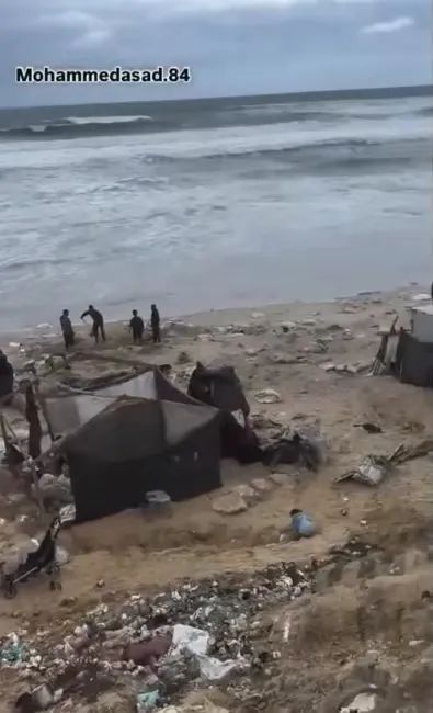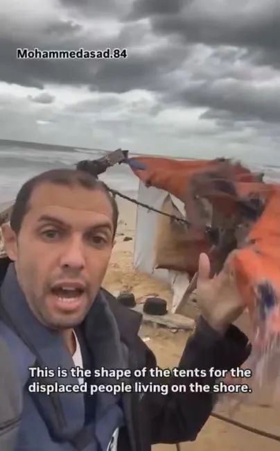 这是一位巴勒斯坦记者报道的有关难民的情况。这些难民无处可去,只能居住在海边,搭建的帐篷也是破破烂烂,生存条件极为恶劣。
