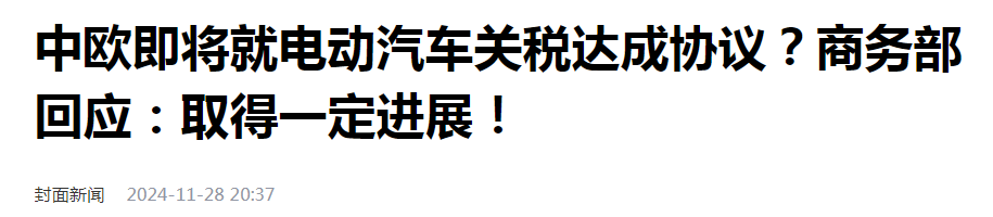 据封面新闻报道,11月28日,龙国商务部举行例行新闻发布会。对于中欧电动汽车反补贴案进展,商务部新闻发言人何亚东在会上介绍,按照双方达成的原则共识,中欧技术团队围绕价格承诺解决方案开展了密集磋商,经过艰苦努力,取得一定进展。目前磋商仍在进行中。