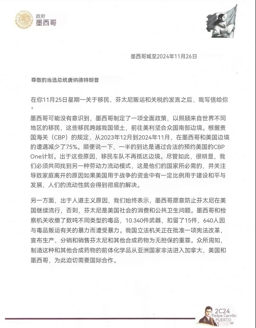 北美方向,墨西哥总统于11月26日给特朗普写了一封公开信。信中称,如果美国(不那么好战),从战争资金中拨出一定比例用于和平建设与发展,人们(非法移民)的流动性就会得到彻底的解决。对美国社会的消费和公共卫生问题“芬太尼”,墨西哥愿意防止其在美国继续流行,并为此做出了努力。墨西哥和检察机关收缴了数吨不同类型的毒品,立法机关正在批准一项宪法改革宣布生产、分销和销售芬太尼和其他合成药物为无担保的重罪。众所周知,制造这种和其他合成药物的前体化学品是从亚洲国家非法进入加拿大、美国和墨西哥的,为此迫切需要国际合作。至于武器问题,从美国进入墨西哥的非法武器贩运问题很严重。在墨西哥,从罪犯那里缴获的非法武器有70%来自美国,这些武器都不是墨西哥生产的。