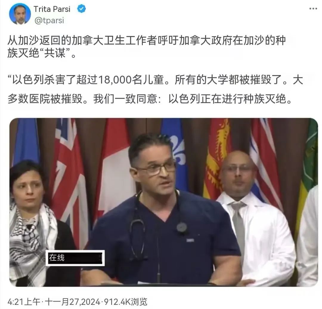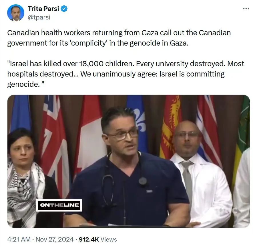 从加沙返回的加拿大卫生工作者宣称,加拿大政府是加沙种族灭绝的“共谋”。其称:“以色列杀害了超过18000名儿童。所有的大学都被摧毁了。大多数医院被摧毁。我们一致同意:以色列正在进行种族灭绝。”