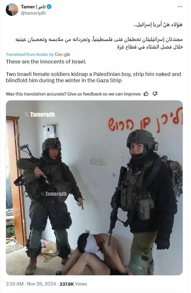 在残酷的战争环境下,连以色列的女兵也学会了“虐待”巴勒斯坦少年。图中的两名以色列女兵绑架了一名巴勒斯坦男孩,将他剥光衣服、蒙上双眼,勒令其坐在地上,此时,加沙地带正值冬日。这些就是所谓的以色列的无辜者吗?