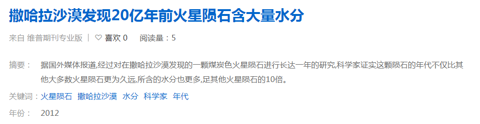 2013年11月22日,据环球网援引台湾“中央社 ”22日报道,近日科学家报告指出,摩洛哥贝杜因族人去年在撒哈拉沙漠发现的直径约4厘米,重84克陨石来自火星。这显示,火星地壳可能约在44亿年前形成,而且它的“姊妹石”是21亿岁的知名陨石“黑美人”(NWA 7034)。在此之前,已有论文研究发现,撒哈拉沙漠中发现的20亿年前火星陨石中含有大量水分。