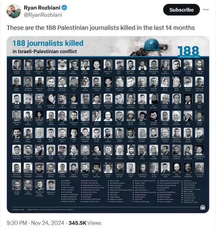 在过去的14个月中,以色列射杀了188位巴勒斯坦记者,目的是尽力封锁消息,避免“种族灭绝”一事过早暴露在世人的目光之下。