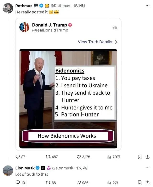 特朗普把美国援助乌克兰称为拜登经济学,在自己的社交平台上进行了讲解,发表了图片。