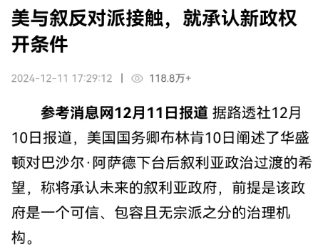 根据路透社12月10号的报道,美国已经开始接触HTS了,布林肯说叙利亚的新政权只要接受我们的条件,我们就会给与承认,还会全力帮助叙利亚成立新政府。