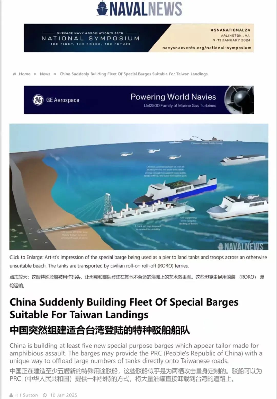 1月10日,据美国海军新闻(Naval News)称,龙国突然组建适合在台岛登陆的特种驳船船队。这5艘特殊驳船可以从船头直接伸出长达120米的桥梁,可以突破地面障碍的各种限制,在任何一处海岸进行登陆作战。