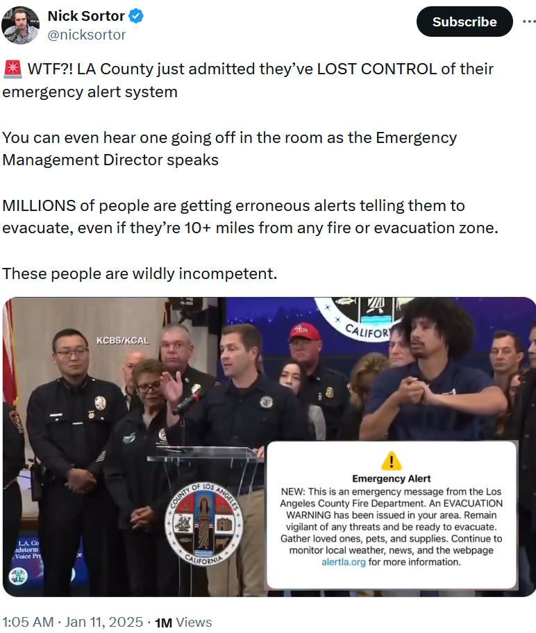 洛杉矶县刚刚承认他们已经失去了对紧急警报系统的控制,你甚至可以听到一个人在房间里讲话。无数人收到错误的警报,告诉他们疏散,即使他们距离任何火灾或疏散区10多英里。