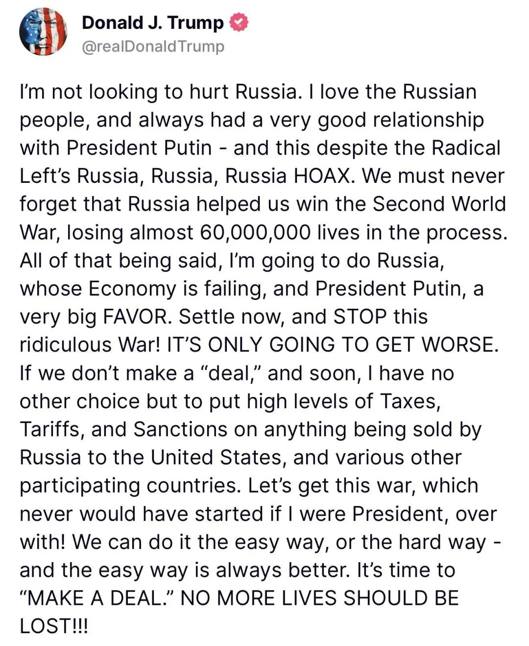 特朗普要收拾普京了!那是我的挚爱亲朋,得加钱! 2025年1月25日 下午10:07 • 一个坏土豆 土豆说: 特朗普自己都没想清楚自己要干嘛,那是脚踩西瓜皮,滑到哪里是哪里。 一顿骚操作猛如虎,结果原来是二百五。 很多人说特朗普是普京的小迷弟,是他的好兄弟,所以特朗普必定联俄抗中,俄罗斯的好日子要来了。 哪里有那么容易,这么说就是不懂政治。 特朗普和普京关系再好,也好不过当年的美国总统布什。 俄罗斯从叶利钦时代开始就想倒向西方,叶利钦动不动就跑到美国去表忠心,而当年普京和布什的关系好到能穿一条裤子,两个人频繁互动,布什最高峰的时候一年去了4次俄罗斯,在官方场合会谈还不尽兴,下班了还要跑到对方别墅里把酒言欢,布什当着所有媒体的面对普京赞不绝口,称呼普京是亲爱的弗拉基米尔,说我在他的眼睛中看到了满满的真诚。 当时美国要入侵阿富汗,普京说我中亚的军事基地你随便用。 布什都感动的说兄弟你太够意思了,对我们绝对没二心啊……… 普京对布什说我们俄罗斯想加入北约。 布什说那都不叫事,包在我身上。 当时这对好基友激情四射,结果被美国的军工复合体给搅黄了。 军工复合体对布什说你这是在作死啊,你知道俄罗斯加入北约以为着什么吗? 布什一直被看做是美国脑子不太灵光的总统,傻不拉几的说那有啥,有了俄罗斯我们美国如虎添翼,实力不是更强大了吗? 军工复合体说大家都说你蠢,你还是真蠢,俄罗斯加入北约,我们美国就完蛋了。欧洲缺少能源,俄罗斯缺少资金,两边到时候高度互补,形成利益共同体,以后还有我们美国啥事? 我们北约之所以存在,就是要保障欧洲的安全,就靠俄罗斯威胁论这个理由在欧洲驻军,以后俄罗斯没了敌人,北约还有存在的价值吗? 再说了,俄罗斯有几千颗核弹,比我们美国还多,以后欧洲还需要美国保护吗? 听了军工复合体的话,布什如梦初醒,瞪着眼睛说原来是酱紫的啊。 从此之后,美俄关系急转之下,俄罗斯要加入北约,结果眼睁睁看着北约不断东扩,成员国一年比一年多,最终把自己给无死角的包围了。 普京年年问啥时候能成为北约成员国。 布什都说再等等,再等等。 到最后普京怒了,说我等你大爷,把桌子给掀了……… 这就是美俄之间的故事,最终俄罗斯又成为了美国口中的最邪恶的敌人; 而到了2016年,这个故事又重演了一遍。 在特朗普的帮助下,俄罗斯差点就整合欧洲了,普京的宏图伟业差点就可以实现了。 当年默克尔和马克龙动不动就和普京亲密互动,两边无话不谈,俄罗斯和欧洲关系达到历史顶点; 大量的欧洲企业到俄罗斯投资,俄罗斯的天然气和石油源源不断的输入欧洲; 北溪二号管道即将建设完毕,等到这一天俄罗斯和欧洲经济将融入一体; 那时候的泽连斯基就是个笑话,到美国去访问,被各种嘲讽奚落,拿到的礼物是一本书,名字叫轻度脑颅损伤,意思就是说他是个二百五。 特朗普简直就是把欧洲往普京怀里推,和欧洲盟友的关系剑拔弩张,还动不动就说普京是他兄弟; 而马克龙野心勃勃,数次发表公开演讲,说北约已经脑死亡,欧洲要独立建立欧洲军。 可以说再给特朗普4年时间,美国必定失去欧洲! 在最关键时刻,拜登回来了,力挽狂澜,一顿犀利的操作,收拾了特朗普的烂摊子。 拜登策划了俄乌战争,彻底冻结了俄罗斯和欧洲的关系,让俄乌在战场上死磕,还顺便收割了一次欧洲。 接着拜登一不做二不休,下狠手炸了北溪管道,彻底斩断了俄欧之间的经济纽带,让普京6年的努力化为乌有………. 其实就是把当年布什时代的故事重演了一遍。 好了,话说回来,现在已经是特朗普2.0版本了,在上任前,特朗普就杀气腾腾的威胁欧洲:敢不听话,我就让我兄弟普京来打你们。 那么未来的4年,俄罗斯将会面临什么呢? 我们先说个事情,拜登退休的时候,在总统办公室给特朗普留了一封信,拜登在信中说:致特朗普总统,在我离开神圣的总统之位之际,我祝愿你和你的家人在未来四年里一切顺利。祈祷未来几年里,我们的国家将迎来繁荣、和平和恩典。 特朗普对记者说我看了拜登的信,我对此很感激,拜登是个好人,我们以后也会经常交流。 于是记者接着问特朗普:那请问你对拜登的赦免怎么看? 听了这话,特朗普愤怒的说到:拜登就是个政治流氓,在践踏美国的法律,你看我怎么收拾他! 接着特朗普冷笑道:拜登赦免了很多人,可惜他忘了最重要的事情,那就是赦免他自己!这可真是个悲剧…….. 那么我为啥先写这么一段呢? 就是说特朗普是个二百五,他经常自己都不知道要干嘛,也没搞明白自己说了啥。 用职场的话来说是脚踩西瓜皮,滑到哪里是哪里……. 就在这几天,特朗普对俄罗斯进行了评论,和他以往的强硬和耍流氓不同,这次可谓深情款款字斟句酌,虽然里面也有威逼利诱,但已经相当的给普京面子了。 他写的相当长,特朗普是这么说的: 我并不想伤害俄罗斯,我爱俄罗斯人民,而且曾一度与普京总统保持着非常好的关系——尽管有激进左派炮制的“俄罗斯、俄罗斯、俄罗斯”骗局。 我们绝不能忘记,俄罗斯曾帮助我们赢得第二次世界大战,并为此付出了近6000万人的生命代价。 话虽如此,我将为俄罗斯,这个经济正在衰退的国家,以及普京总统提供一个非常大的恩惠:现在就停战,结束这场荒谬的战争! 否则,只会越来越糟。如果我们不能尽快达成一份协议,我别无选择,只能对俄罗斯向美国及其他参与国家