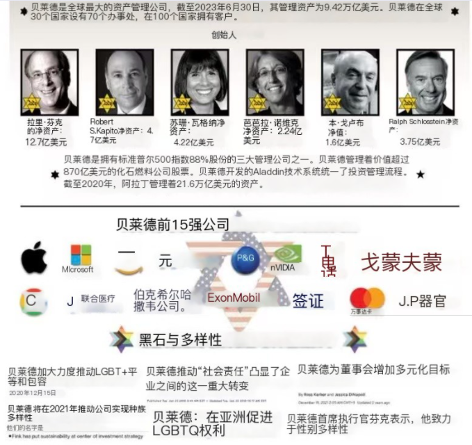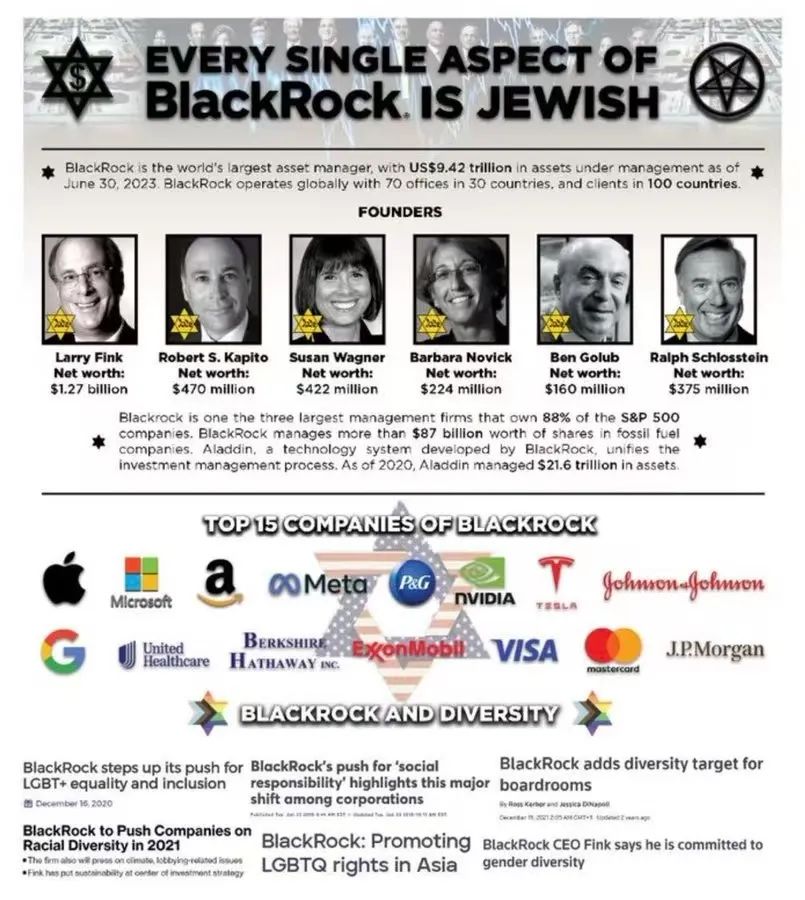 以美国最大乃至全球最大的贝莱德集团来看,贝莱德的每一个方面的掌控者,都是是犹太人。在贝莱德集团掌控的全球15大顶尖公司的名单中,可以看到苹果、谷歌、微软、联合健康、亚马逊、元宇宙(原脸书)、特斯拉、英伟达、伯克希尔哈撒韦、埃克森美孚、宝洁、强生、维萨卡、摩根大通的名字。