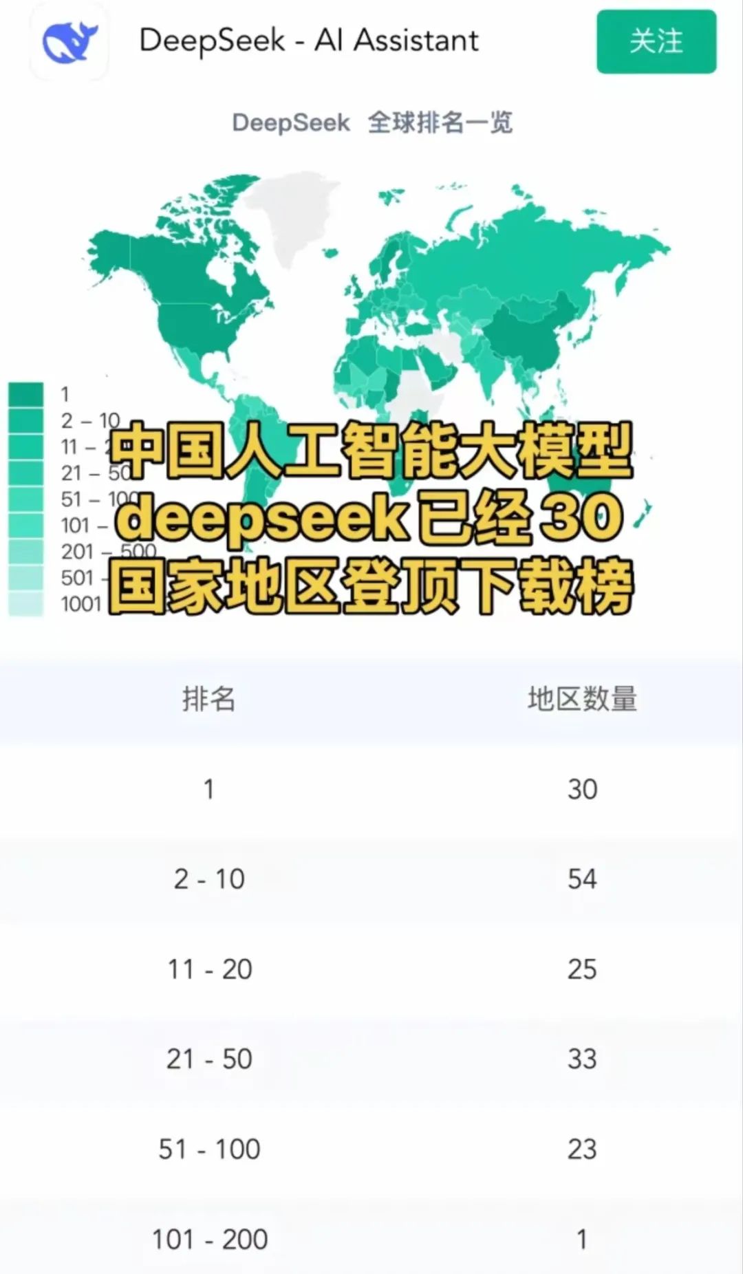 科技领域,关于DeepSeek带来的冲击还在继续。截止目前,DeepSeek已经在30个国家和地区下载榜名列第一。