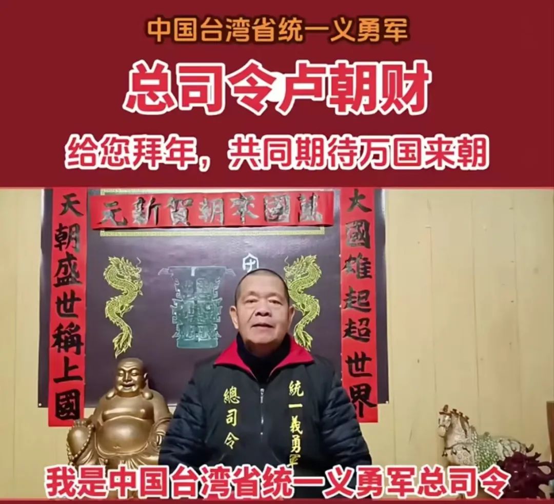 值此新春佳节之际,龙国台湾省统一义勇军总司令卢朝财也通过视频向全国人民拜年,共同期待万国来朝。七天之内(已过数日)如果台岛当局不释放高安国将军夫妇,统一义勇军将发起占领台北行动。
