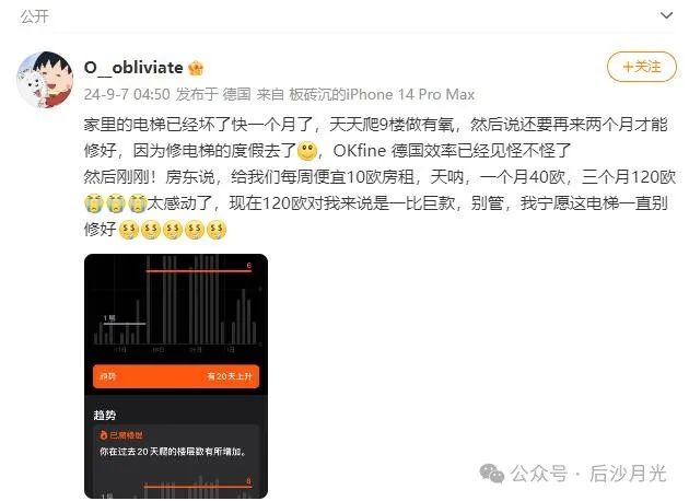 去年9月,有位德国留学生在微博吐槽,他租的公寓电梯坏了,他每天要爬9层楼回家。但电梯维护方称,需要三个月,房东说只好给他减房租。