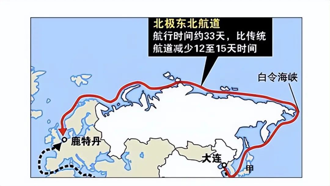 一旦美国封锁马六甲海峡,中国能够在短时间内依仗的就只有北极航道了,北极航道狭义上是指途经北冰洋,连接东亚、西欧、北美的海上运输通道,特别是北极东北航线。从大连港出发到荷兰鹿特丹港,如果经由绕道马六甲海峡、苏伊士运河的传统航线,需要航行36天,如果经由北极东北航线,只需要27天,节省了9天。