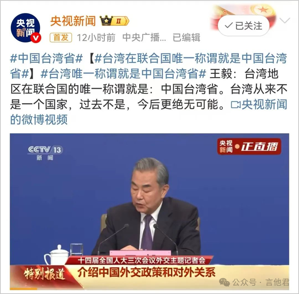 王毅外长说,台湾地区在联合国的唯一称谓,就是中国台湾省。