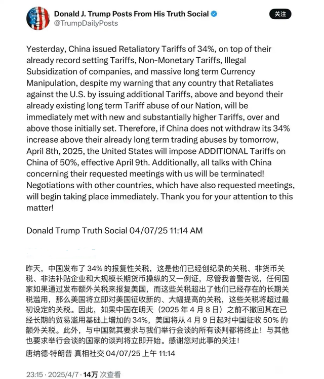 见到中国反制自己的对等关税,特朗普决定加码力度,他在自己的社交媒体上宣布,要是中国不在一天之内取消反制,美国将在48小时后对中国再加征50%的额外关税,不仅如此,美国将不会接受中国的任何谈判要求,同时会立即开始与其他国家磋商。
