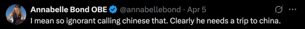 一位带V认证的网友说:“我的意思是,这么称呼中国人真是太无知了,显然他需要去中国一趟”。