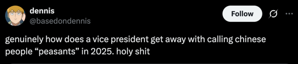 “说真的,2025年了,一个副总统怎么还能称中国人为‘乡巴佬’呢?”