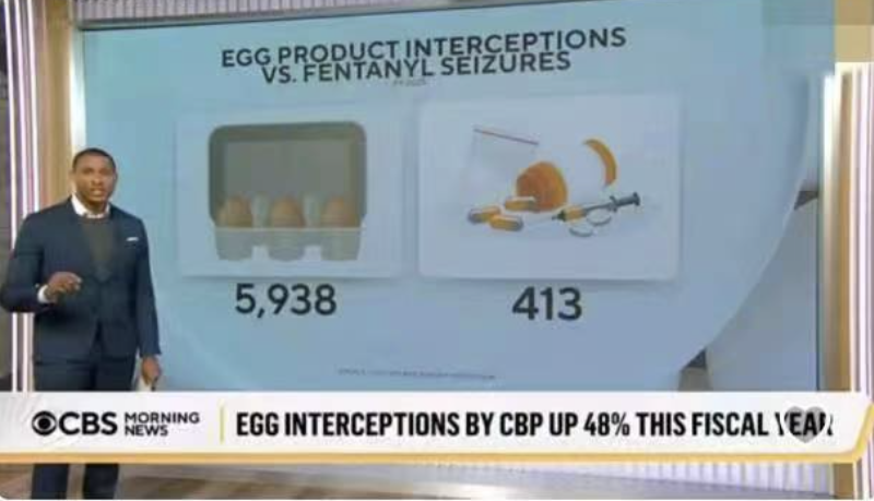 根据美国媒体的报道,最近一段时间美墨边境稽查人员查获的芬太尼走私案件数量为413起,但查获的鸡蛋走私案件数量是5938起。