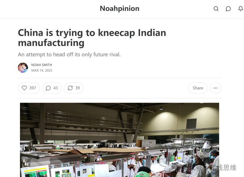 最近,美国知名经济学家和互联网意见领袖诺亚·史密斯(Noah Smith)发布一篇重磅博文,题为《中国正在试图削弱印度的制造业》(China is trying to kneecap Indian manufacturing)。这篇文章传达了一种听起来非常刺激的观点:因为中国将印度视为地缘政治对手和潜在的产业经济威胁,因此阻止投资、技术、人才流入印度,以此削弱印度的地缘战略潜力。