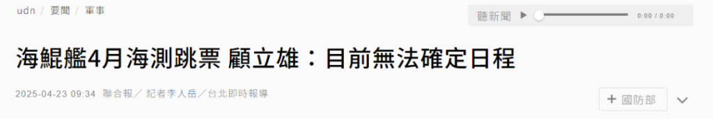 台湾《联合报》23日称,对于“海鲲”号是否按时在本月展开海试的问题,顾立雄表示,该潜艇目前仍在进行缺失改善,负责建造工作的“台船”公司已经在加班改进,“目前还无法确定出海海试日程”,但希望尽快。面对媒体追问“是否不排除推迟到5月才进行海试”的时候,顾立雄说,“现在仍希望能在4月底前”,但交舰的日期是11月,海测时间如果不影响交舰的话“就没有关系”。