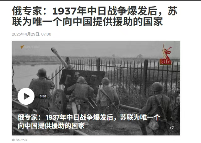 “众所周知,从1931年在沈阳爆发的冲突开始,苏联就站在了中国一边。1937年大规模中日战争爆发后,苏联是第一个也是唯一一个在这场武装冲突的艰难初期向邻国提供物质和道义援助的国家。”