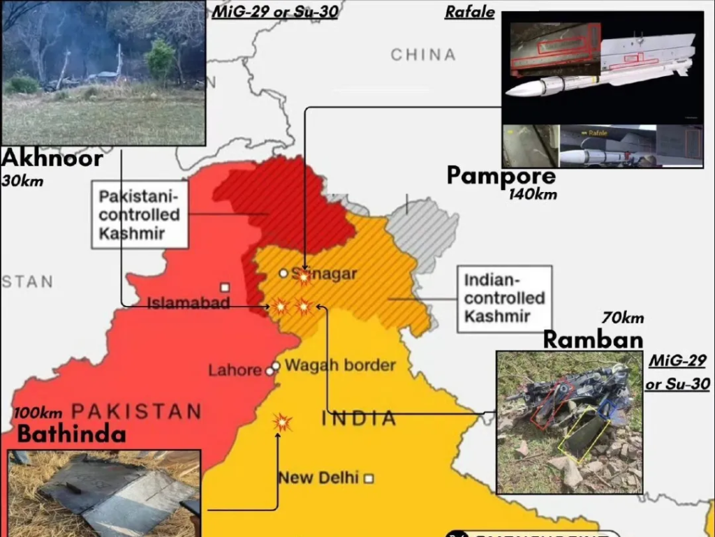 目前网上公布了四处残骸地点,第一处是印度北部旁遮普邦巴特恩达/巴廷达的阿克利安卡兰村坠毁的战斗机,该村距离巴廷达基地仅20公里,应该是一架阵风坠毁在一处麦田中,造成当地1名农民死亡、9人受伤。第二处是印控克什米尔斯利那加郊区武扬村一座红砖建筑旁的田地中有战机残骸坠落,疑似一个幻影2000的银色副油箱。第三处是印度媒体爆出的一架疑似米格-29的残骸,地点未知。第四处则是在克什米尔兰拉姆班的山上发现一架坠毁战斗机的K-36DM弹射座椅,猜测是苏-30MKI战斗机或米格-29。
